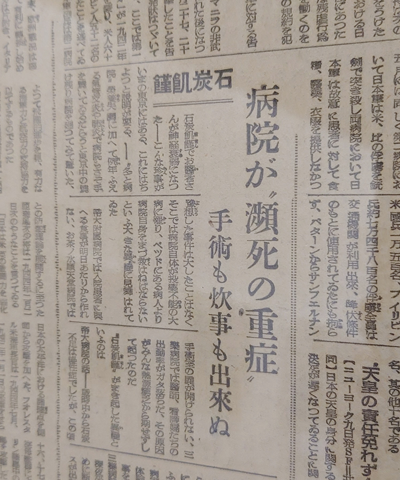 病院では、石炭の代わりとなる木炭や薪の配給も期待できず、木造建物を取り壊し、不要となった防空壕用材を発掘するなどしてしのいできましたが、まもなく患者の食事を作ることができなくなると報じられています。