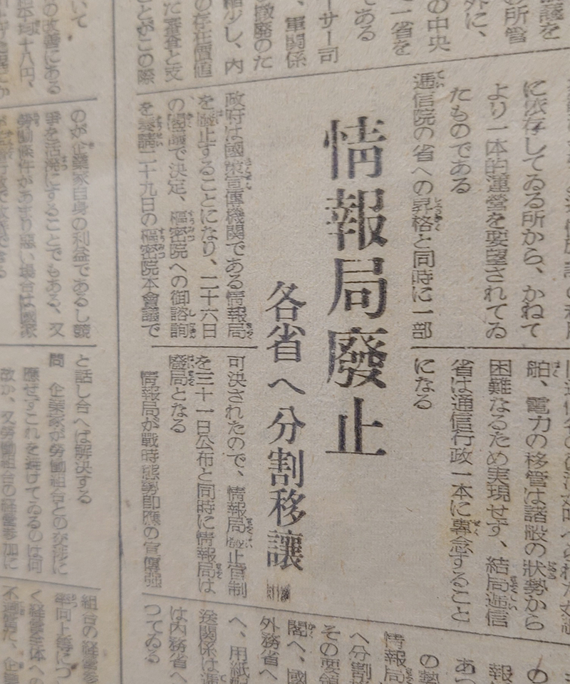 2日、GHQ(連合国軍総司令部)により、戦争犯罪人として、昭和戦前期に首相を務めた平沼騏一郎と広田弘毅ら59人に逮捕命令が出されました。翌6日には、日中戦争の端緒となる盧溝橋事件や日独伊三国軍事同盟締結時の首相・近衛文麿や天皇側近の内大臣・木戸幸一ら9人にも逮捕命令が出ました。1940(昭和15)年に設立され、国策遂行に関する情報収集・宣伝・統制を進めてきた情報局は31日に廃止になりました。