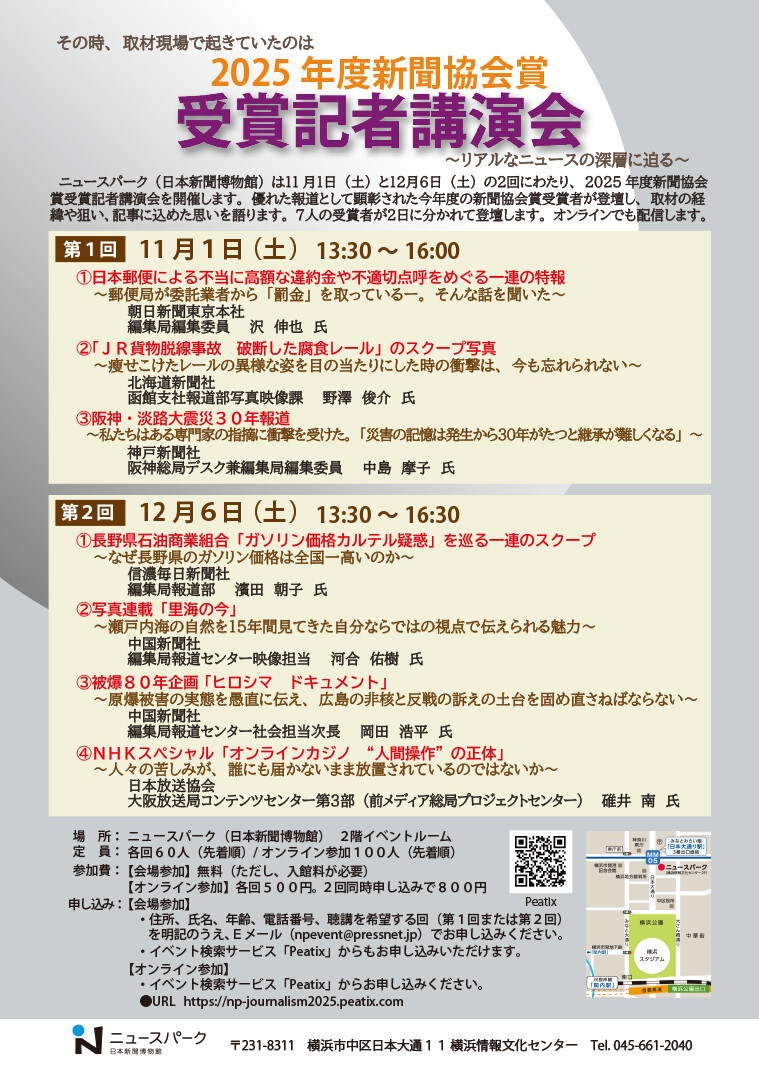 ニュースパーク(日本新聞博物館)は11月1日(土)と12月6日(土)の2回にわたり、2025年度新聞協会賞 受賞記者講演会を開催します。優れた報道として顕彰された今年度の新聞協会賞受賞者が登壇し、取材の経緯や狙い、記事に込めた思いを語ります。7人の受賞者が2日に分かれて登壇します。