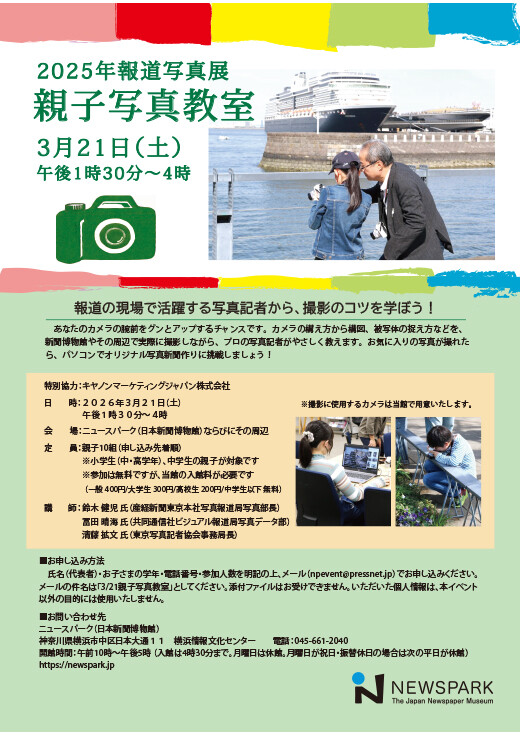 | お申し込み方法 | 氏名(代表者)・お子さまの学年・電話番号・参加人数を明記の上、メール(npevent@pressnet.jp)でお申し込みください。メールの件名は「3/21親子写真教室」としてください。添付ファイルはお受けできません。いただいた個人情報は、本イベント以外の目的には使用いたしません。 |
